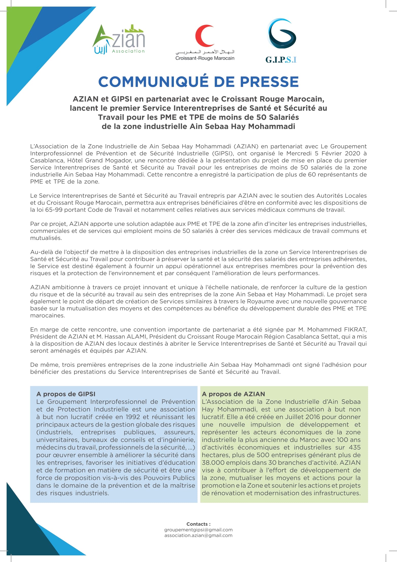 MissionPrévenir toute altération de la santé des travailleurs liée à leur activité professionnelle.Structure mutualisée pour PME/TPE (-50 salariés)A partir de 500 salariés:Un cabinet médicalUne salle d’investigations complémentairesUne salle de soinsUn local d’attente à proximitéDes installations sanitairesÉquipe typeMédecin du travail (temps partiel)Ingénieur HSE (temps plein)Infirmier(ère) (temps plein)PartenairesMinistère du Travail et de l’Insertion ProfessionnelleAZIANCroissant Rouge MarocainConvention Communiqué de presse